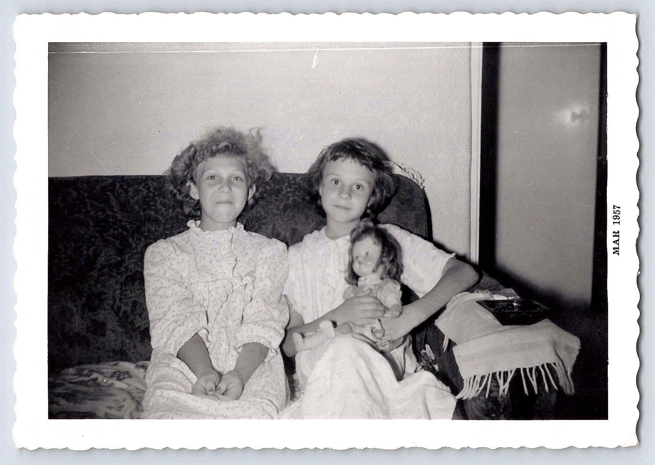 This 3.5 × 5 inch photograph captures a charming scene of two children seated on a couch, with one holding a doll. The image is a black and white print, typical of the mid-20th century, and features scalloped edges, adding a decorative touch. The children are dressed in patterned pajamas, suggesting a cozy, domestic setting.