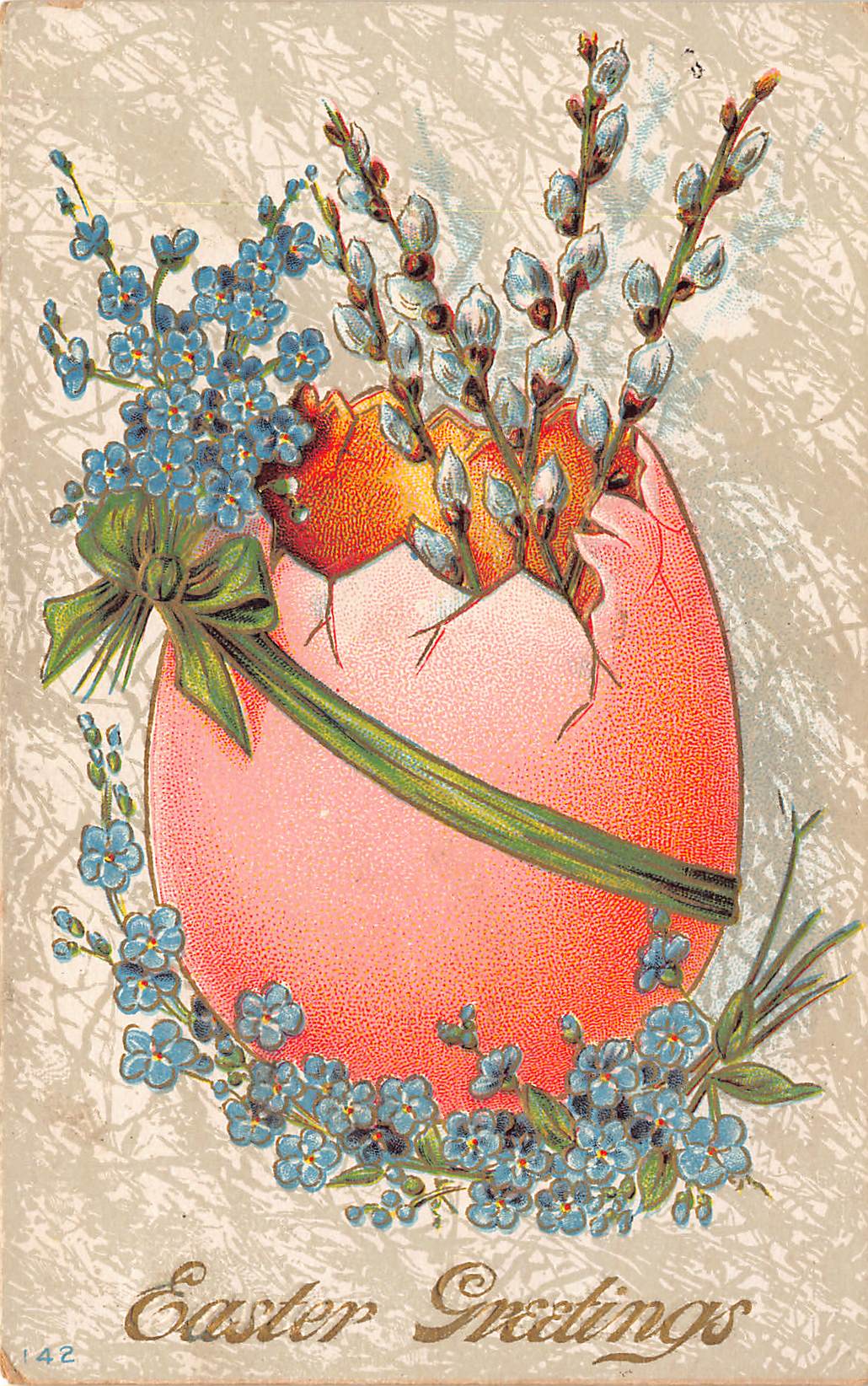 This undivided back postcard features a vibrant Easter scene with a cracked pink egg adorned with blue flowers and pussy willow branches. The greeting 'Easter Greetings' is elegantly scripted at the bottom, capturing the festive spirit of the holiday. The postcard's design and colors are indicative of early 20th-century holiday cards, showcasing intricate detailing and a pastel palette.