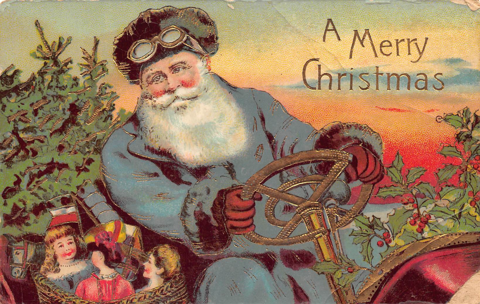 This vintage postcard features a charming illustration of Santa Claus driving a car filled with toys, set against a vibrant sunset backdrop. The greeting 'A Merry Christmas' is prominently displayed, capturing the festive spirit of the early 20th century. The postcard is printed on a divided back, indicating it was produced between 1907 and 1915. The card was made in Germany, known for its high-quality postcard production during this era.