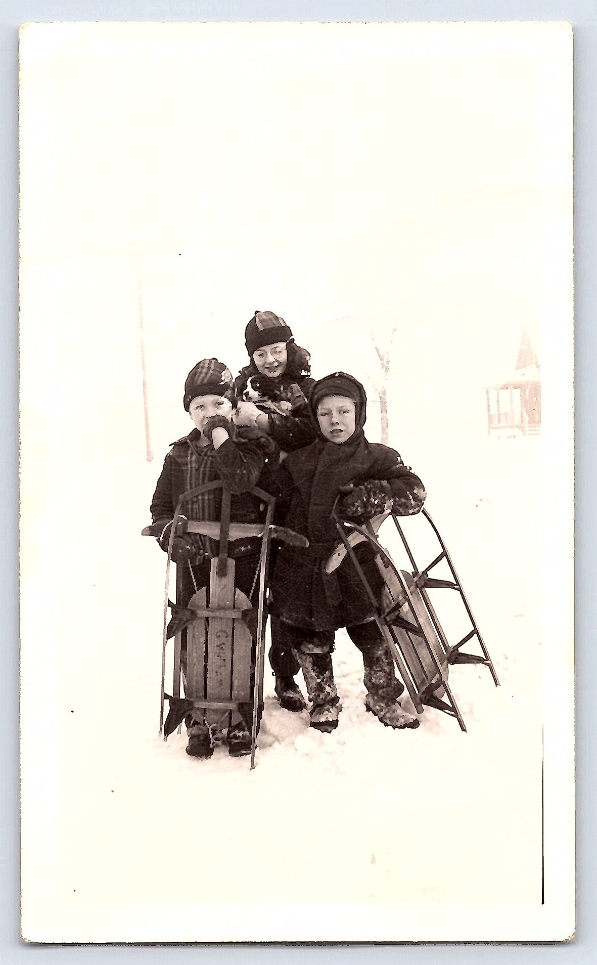 This 2.71 × 4.53 inch photograph captures a charming winter scene of three children posing with sleds in a snowy landscape. The children are warmly dressed, and their expressions convey the joy of a snowy day. The background shows a faint outline of trees and a house, adding depth to the composition. The photograph is a gelatin silver print, a popular technique in the mid-20th century known for its rich tonal range and clarity.