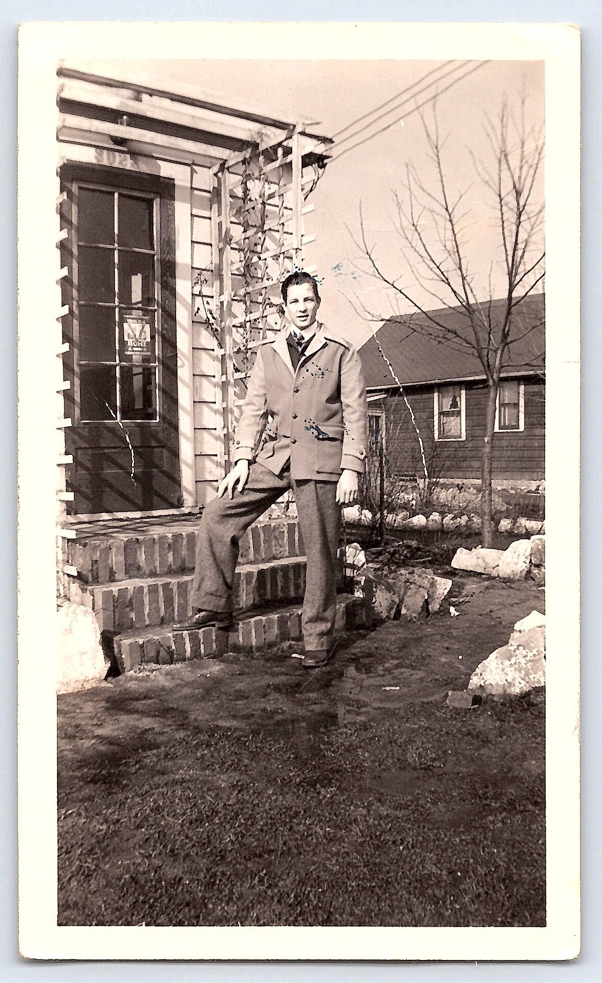This 2.7 × 4.56 inch photograph captures a man standing confidently on the steps of a brick house, dressed in a suit typical of the 1940s era. The background features a leafless tree and a neighboring house, suggesting a late fall or winter setting. The composition is straightforward, with the subject centered and gazing directly at the camera.