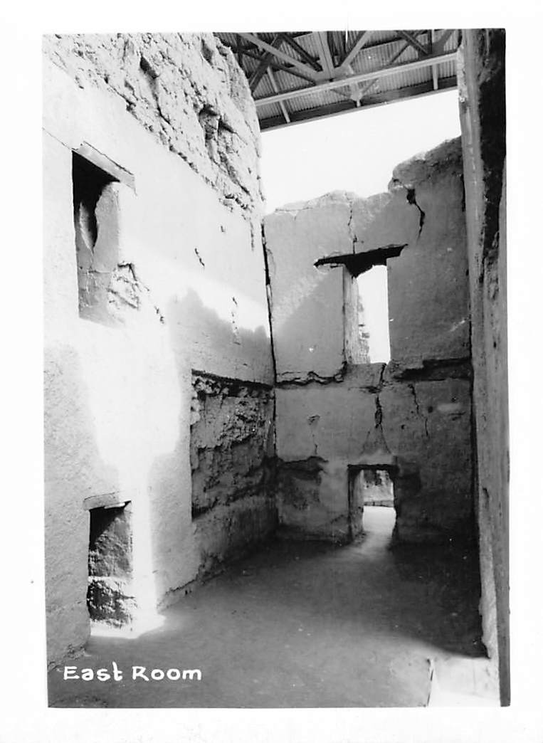 This black and white photograph captures the interior of an ancient structure, labeled as the 'East Room.' The composition highlights the textured adobe walls and the play of light and shadow within the space. The image provides a view of the room's architectural features, including small windows and a doorway, with a modern roof structure visible above.