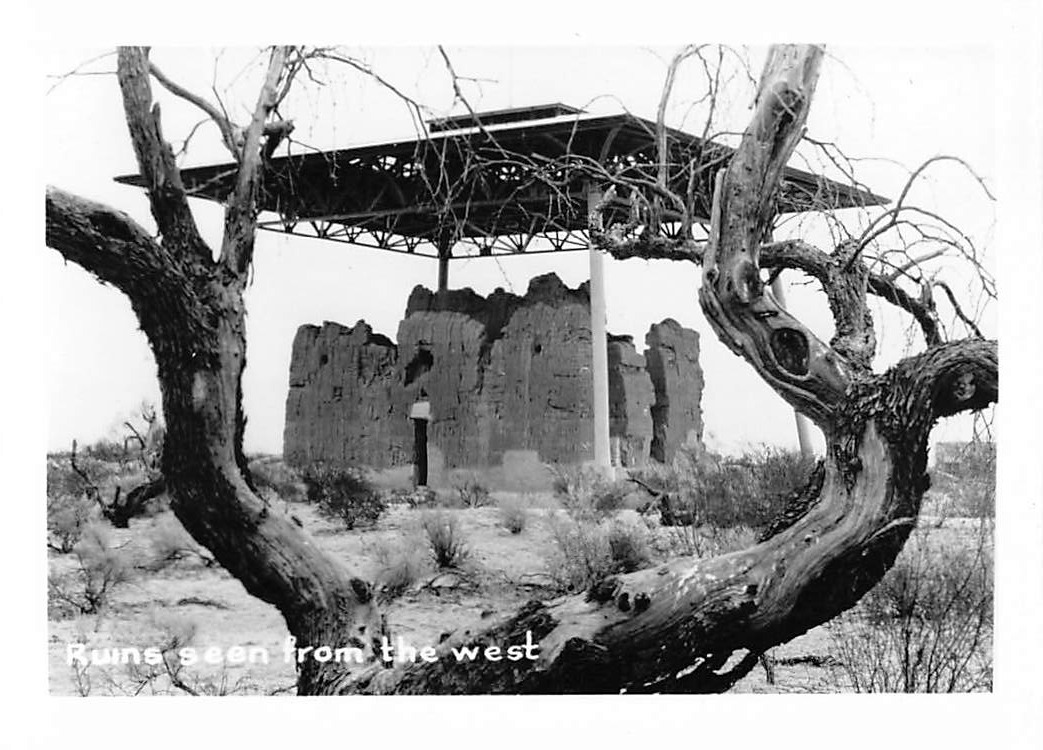 This photograph captures the Casa Grande Ruins in Arizona, viewed from the west. The composition features the ancient adobe structure framed by a gnarled tree in the foreground, with a protective roof structure above. The image is a gelatin silver print, a popular photographic technique in the mid-20th century known for its clarity and tonal range. The text 'Ruins seen from the west' is inscribed at the bottom, providing context to the viewer.