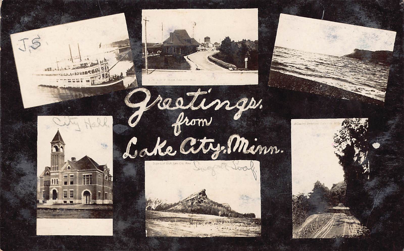 This divided back postcard features a collage of images from Lake City, Minnesota, including a steamboat, city hall, and scenic landscapes. The front design is a classic example of early 20th-century postcard art, showcasing multiple small photographs arranged on a dark background with the handwritten message "Greetings from Lake City, Minn." The images capture the essence of Lake City, highlighting its natural beauty and architectural landmarks.