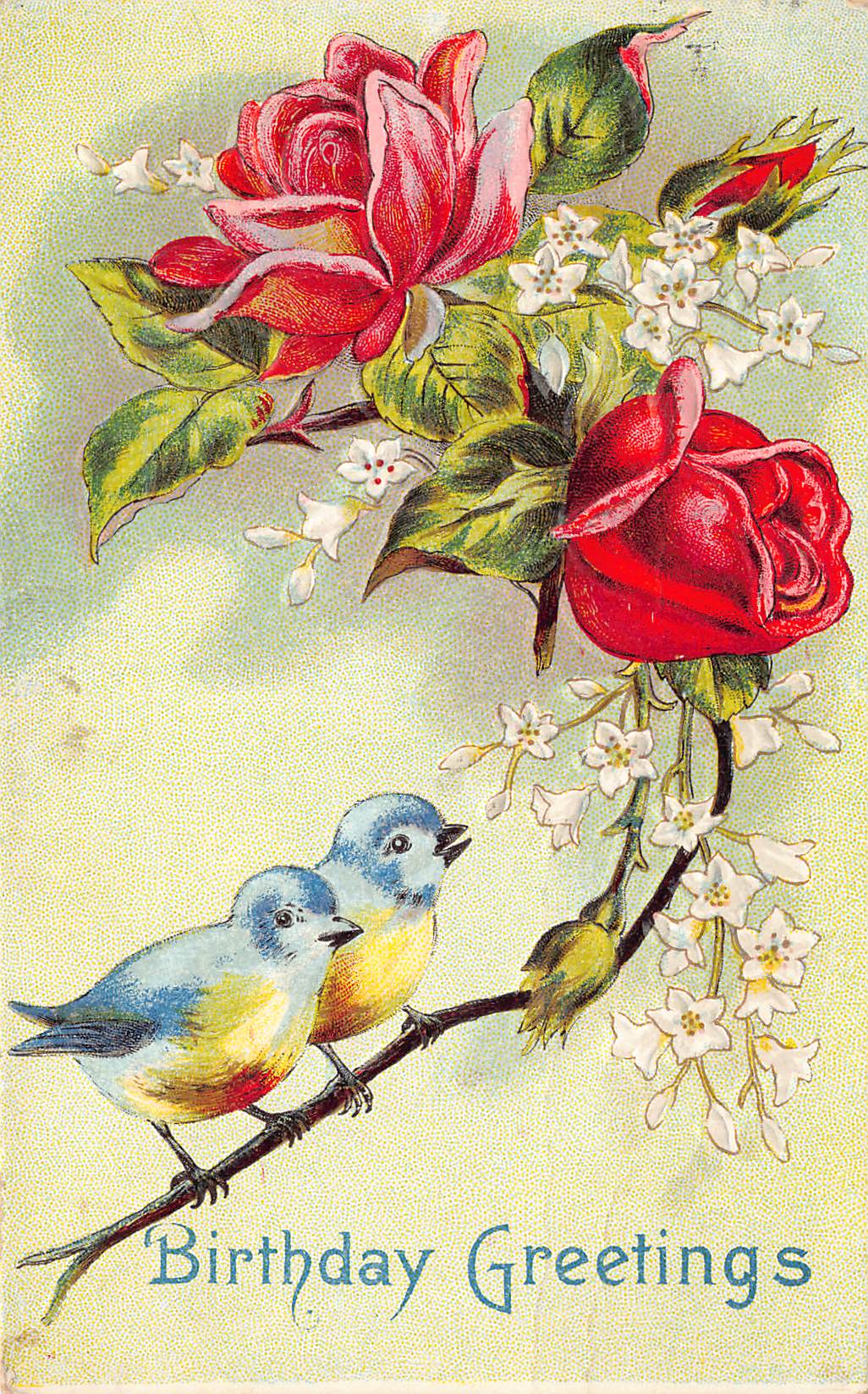 This divided back postcard features a charming illustration of two bluebirds perched on a branch adorned with vibrant red roses and delicate white blossoms. The words 'Birthday Greetings' are elegantly scripted at the bottom, capturing the essence of early 20th-century greeting cards. The card is postmarked May 22, 1912, from Huron, South Dakota, and bears a one-cent green stamp featuring Benjamin Franklin.