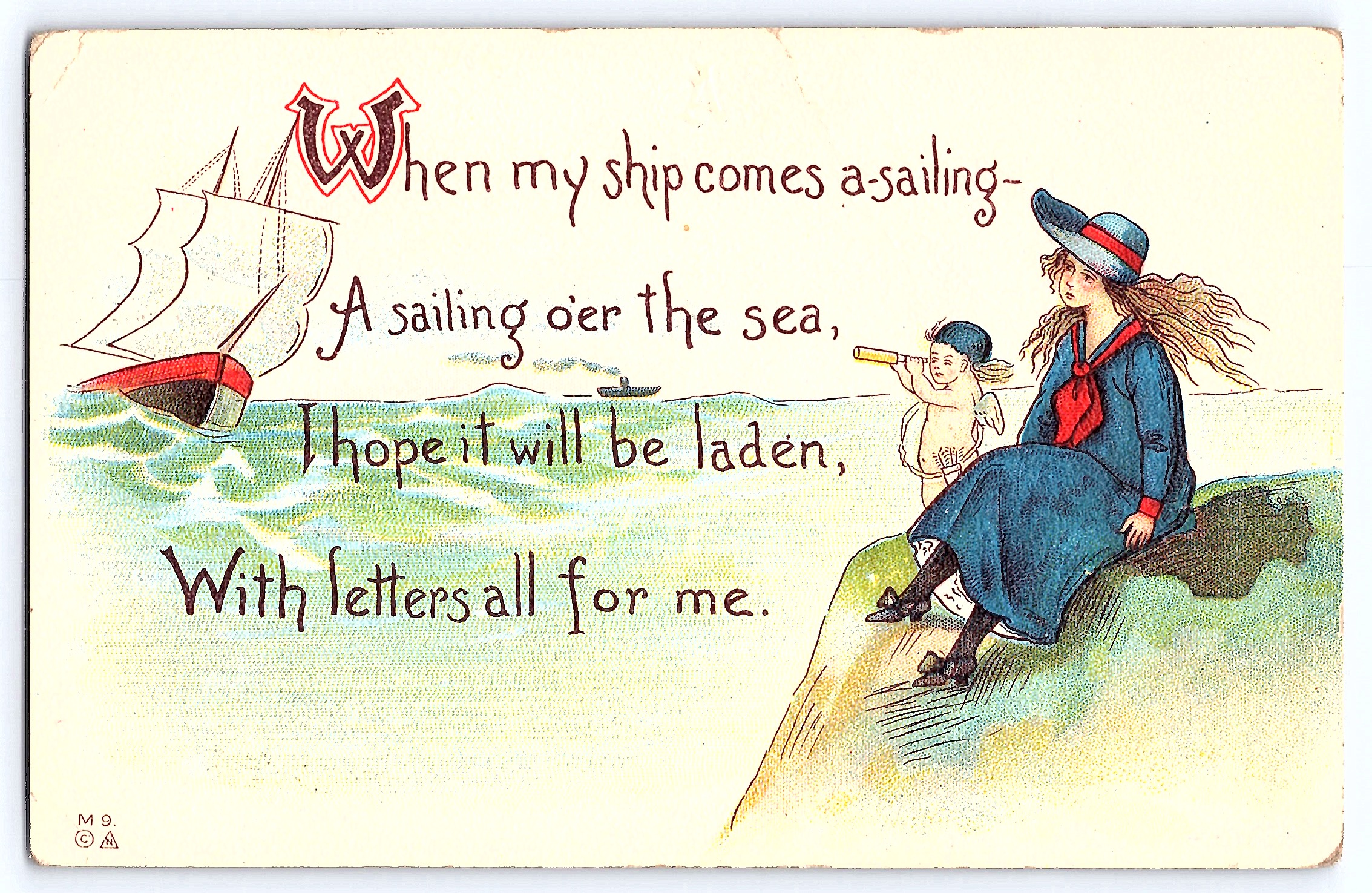 This divided back postcard, published by M9, features a charming illustration of a young woman and child sitting on a grassy hill overlooking the sea. The child holds a small telescope, gazing at a ship sailing on the horizon. The text on the front reads: 'When my ship comes a-sailing—A sailing o'er the sea, I hope it will be laden, With letters all for me.' The postcard captures a whimsical and hopeful scene, typical of early 20th-century postcard art.