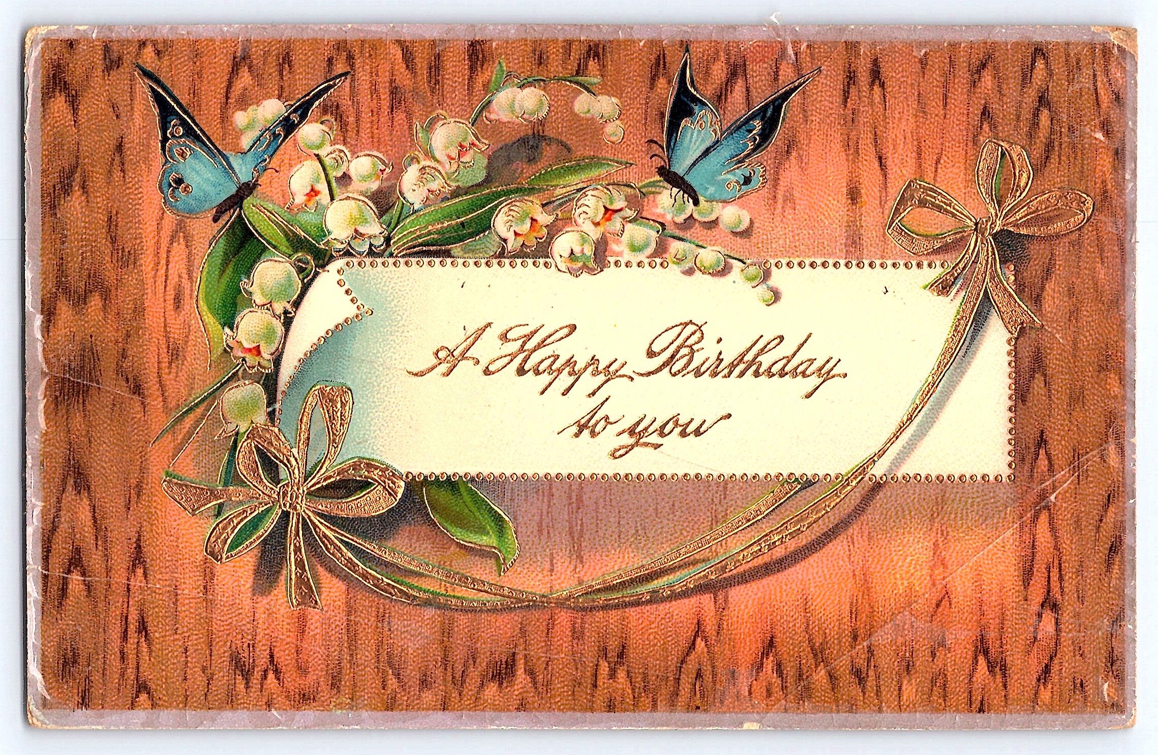 This divided back postcard, printed in Germany, features a charming birthday greeting adorned with butterflies and lily of the valley flowers. The front displays a textured wood-like background with a central message reading 'A Happy Birthday to you,' embellished with gold accents. The postcard's vibrant colors and intricate design reflect the artistic style of early 20th-century greeting cards.