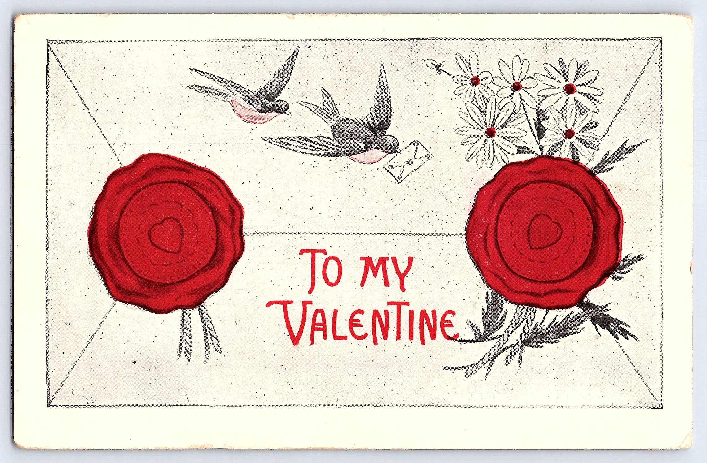 This charming divided back postcard from the early 1900s features a delightful Valentine's Day theme. The front displays two swallows carrying a love letter, surrounded by daisies and sealed with red wax hearts. The phrase 'To My Valentine' is prominently displayed, capturing the romantic essence of the era. The back of the card is divided, indicating it was produced after 1907, with space for both correspondence and address.