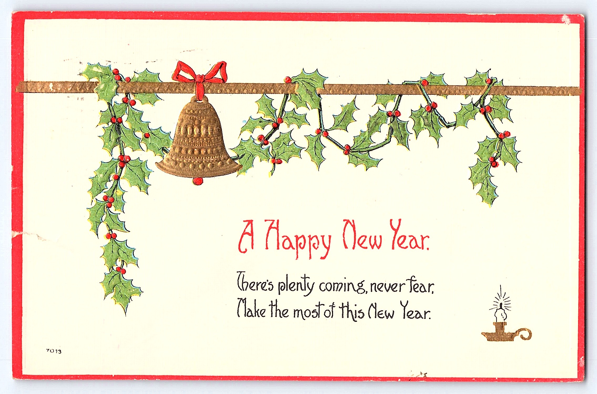 This divided back postcard features a charming New Year greeting with a decorative illustration of holly and a bell, symbolizing festive cheer. The front reads, "A Happy New Year. There's plenty coming, never fear, Make the most of this New Year." The card is bordered in red, adding to its seasonal appeal.