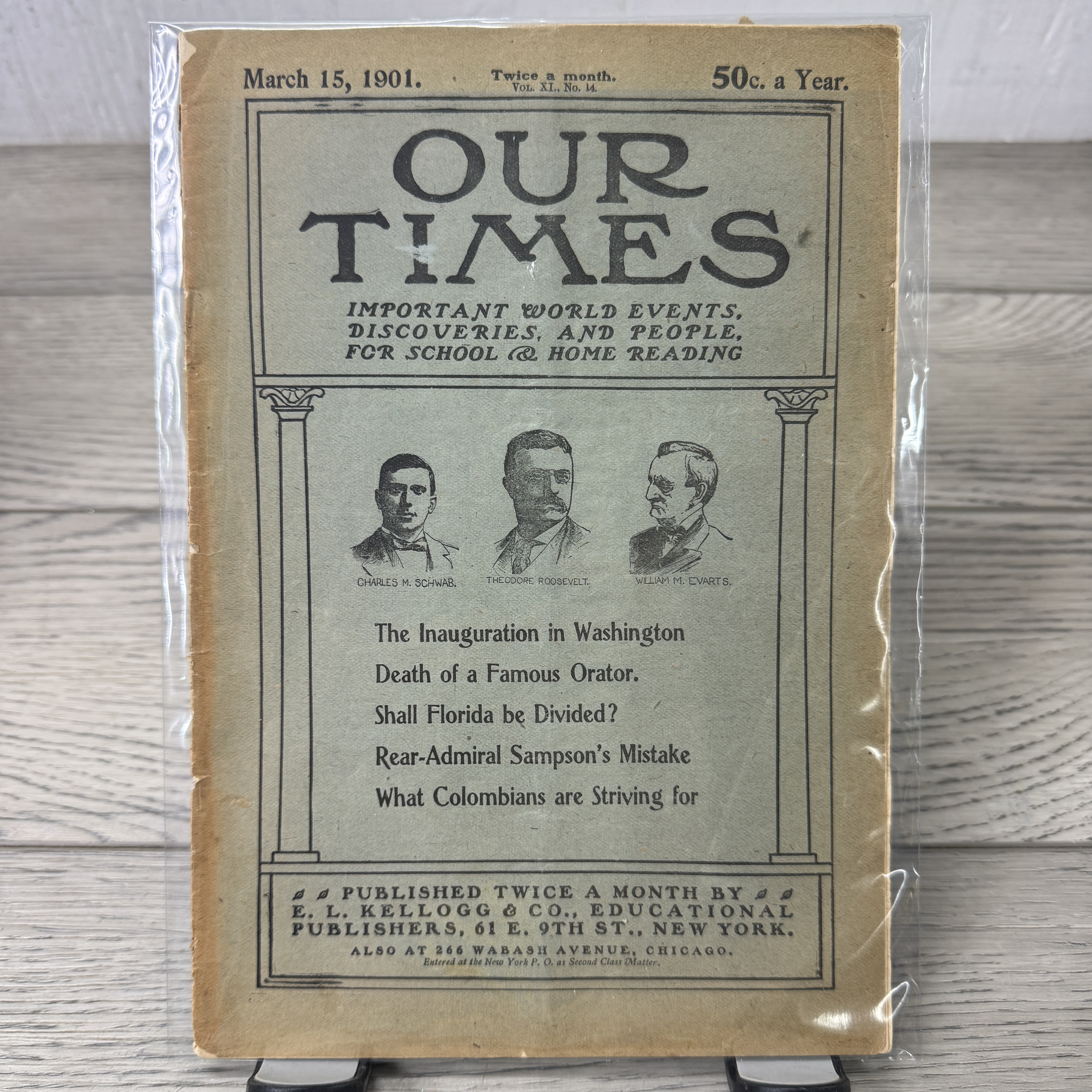 This is a vintage magazine cover from 'Our Times,' dated March 15, 1901, published by E.L. Kellogg & Co. The cover features portraits of notable figures such as Charles M. Schwab, Theodore Roosevelt, and William M. Evarts, highlighting important world events and discoveries of the era. The text promises articles on topics like the Inauguration in Washington and Rear-Admiral Sampson's Mistake, making it a fascinating glimpse into early 20th-century perspectives.