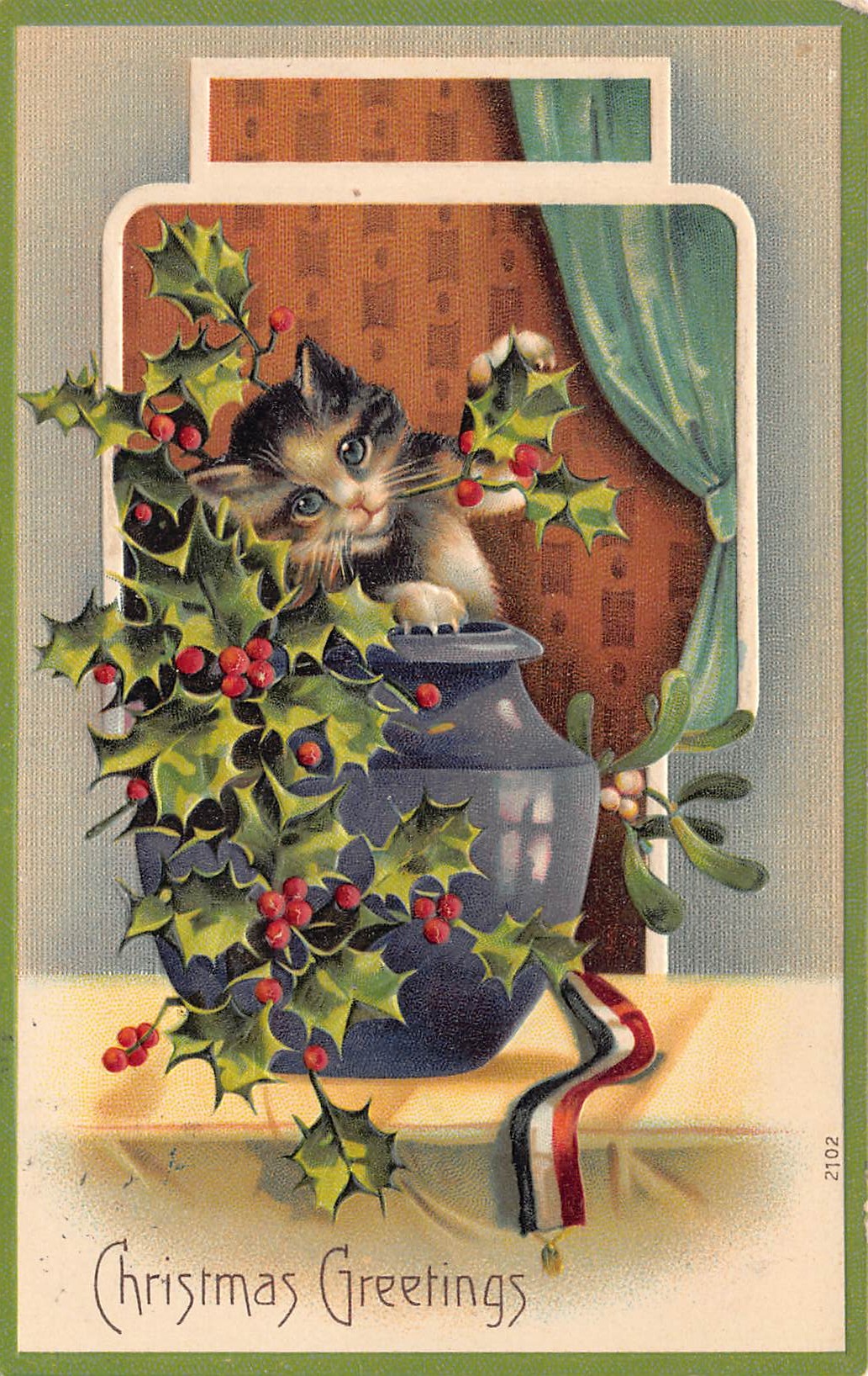Printed in Germany, Embossed Christmas Postcard, Kitten with Holly, 1910