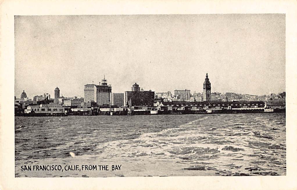 This vintage photo features a panoramic view of San Francisco, California, as seen from the bay. The composition captures the city's skyline, including notable architectural landmarks such as the Ferry Building. The photograph is printed on a postcard, a popular medium for sharing images during the early 20th century. The text 'SAN FRANCISCO, CALIF., FROM THE BAY' is printed at the bottom, providing context and location.