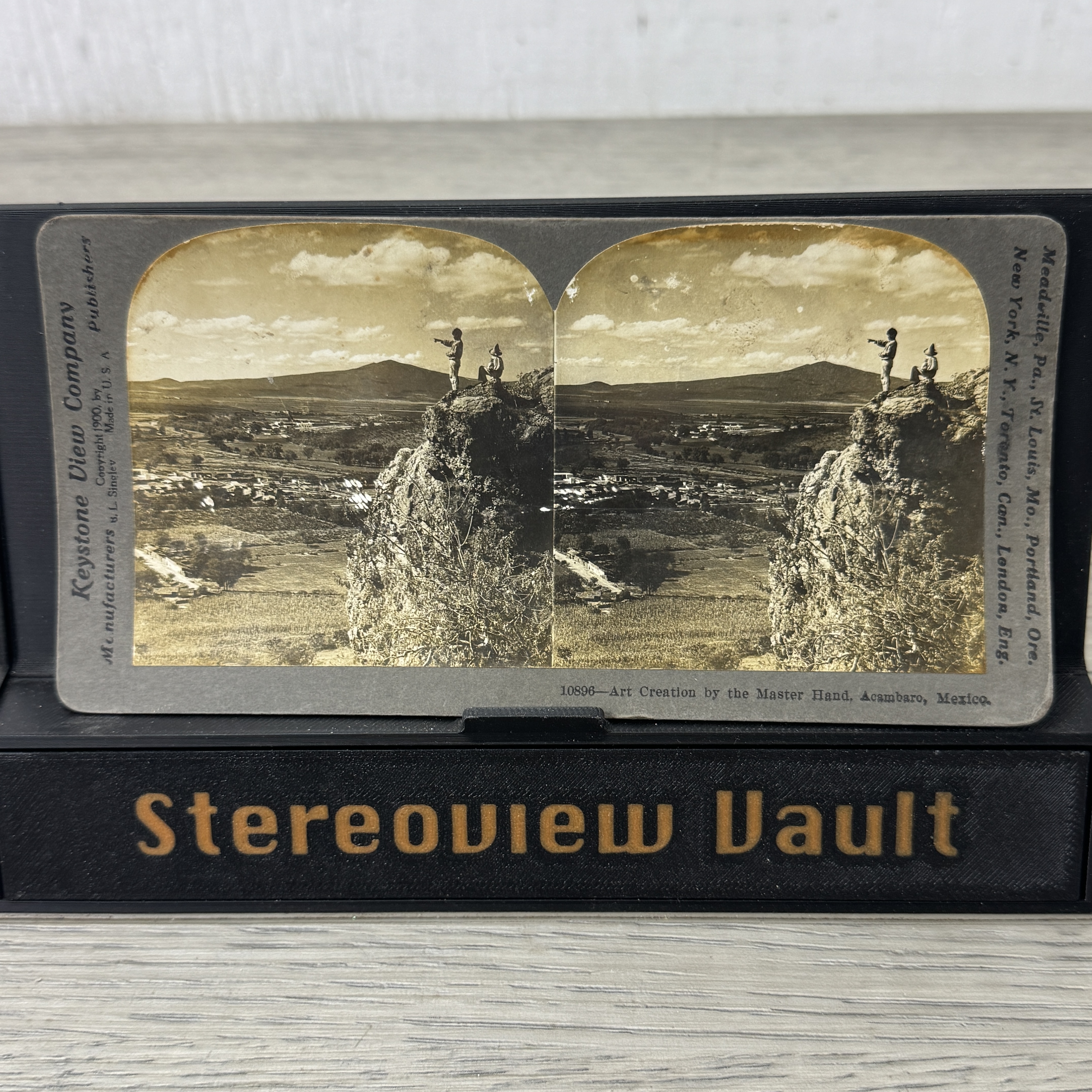 This stereoview card by Keystone View Company, numbered 10896, captures a breathtaking scene titled 'Art Creation by the Master Hand' in Acambaro, Mexico. The image showcases two figures standing atop a rocky outcrop, overlooking a vast landscape of fields and distant mountains. The scene is set on the Mexican plateau, providing a glimpse into the natural beauty and grandeur of the region during the early 1900s.