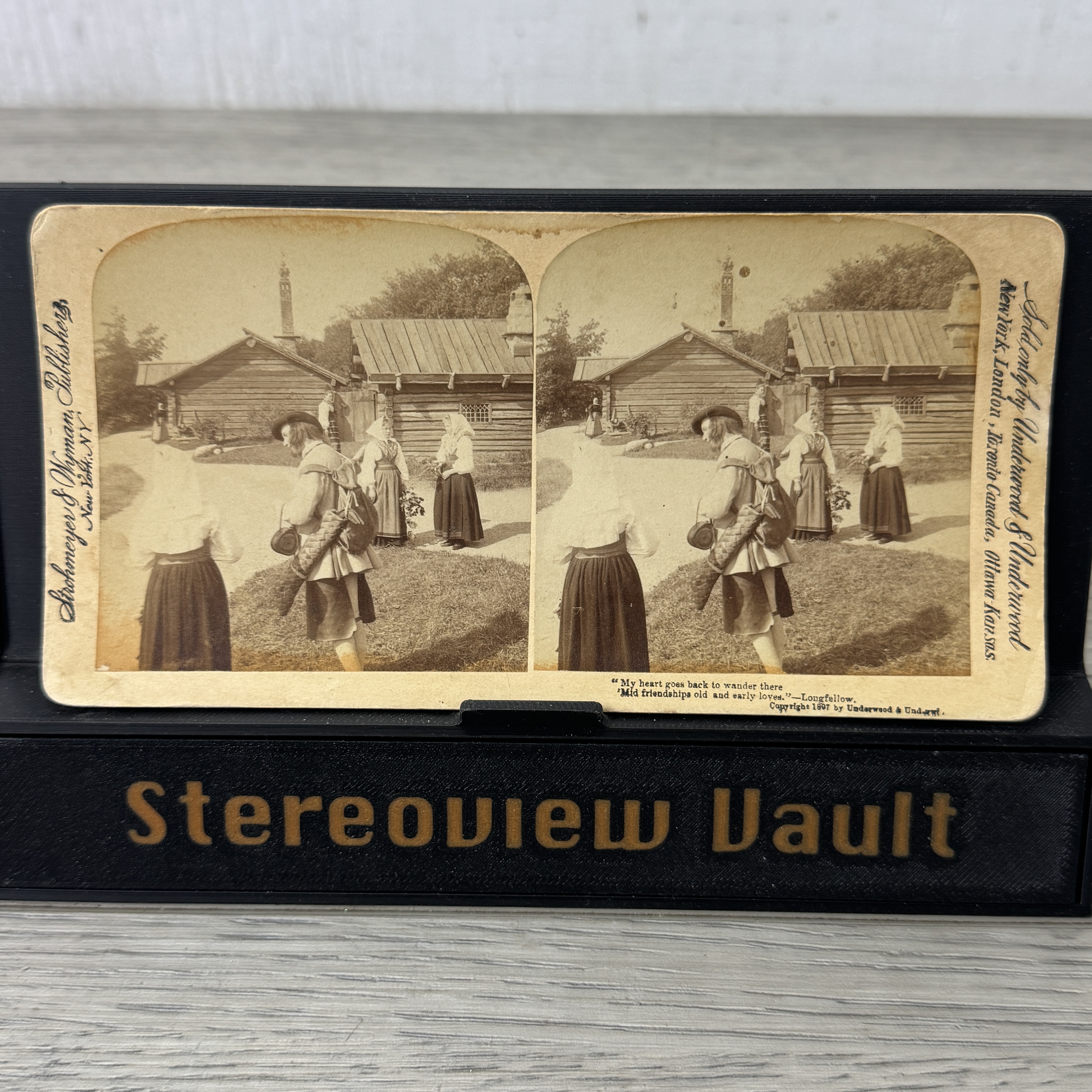This Underwood & Underwood stereoview card, titled 'Village Life and Homes, Sweden,' captures a serene scene of rural life in Sweden around the early 1900s. The image depicts a group of women in traditional attire standing near rustic wooden homes, with one man in period clothing walking towards them. The setting is pastoral, with lush greenery and simple architecture that reflects the rural lifestyle of the time. The card is marked with the publisher's name, Underwood & Underwood, and includes a poetic quote from Longfellow.