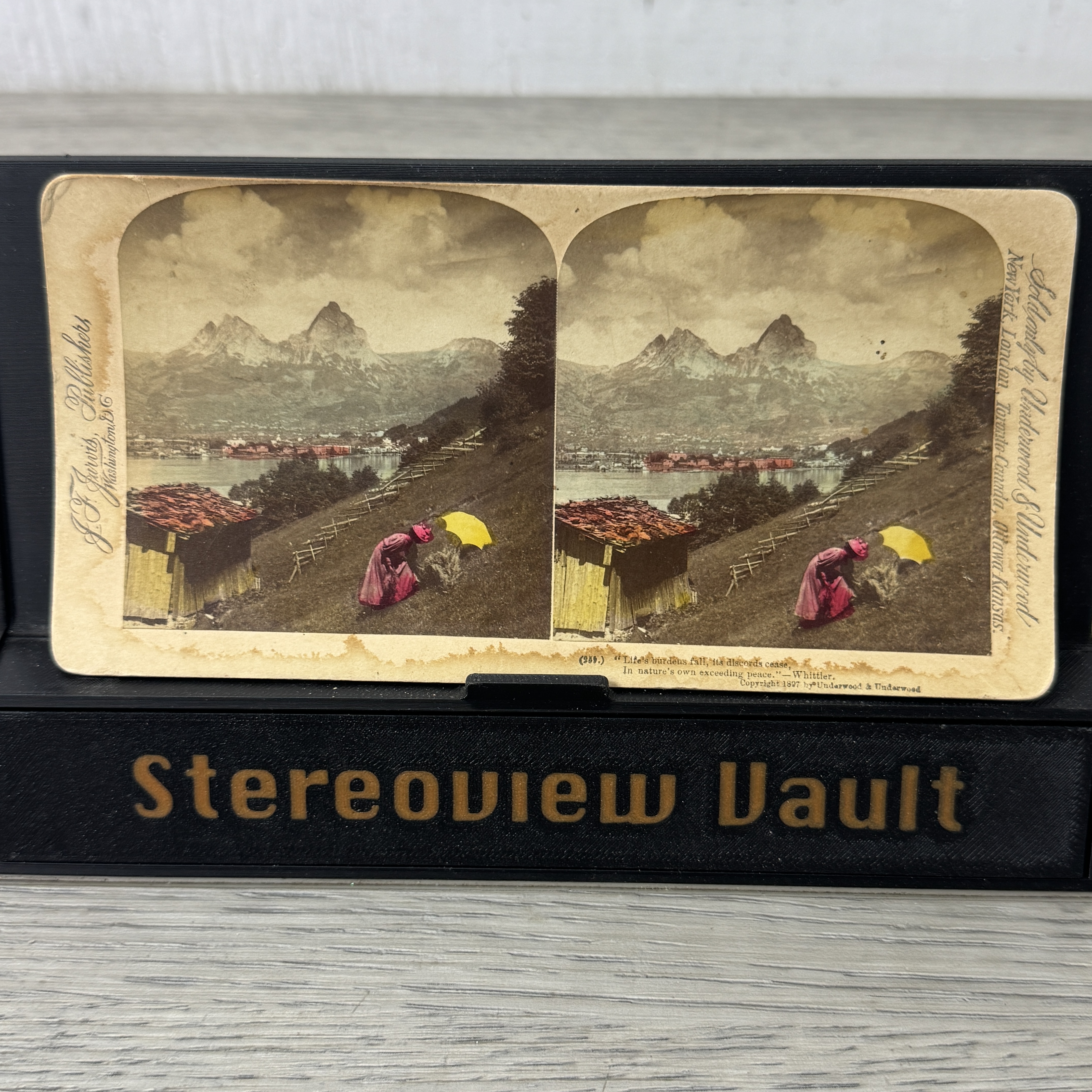 This stereoview documents the scenic beauty of Lake Lucerne and the surrounding Swiss landscape in the early 20th century. Such images were commercially produced to capture and share the allure of travel destinations, making surviving examples valuable records of historical tourism and cultural appreciation.