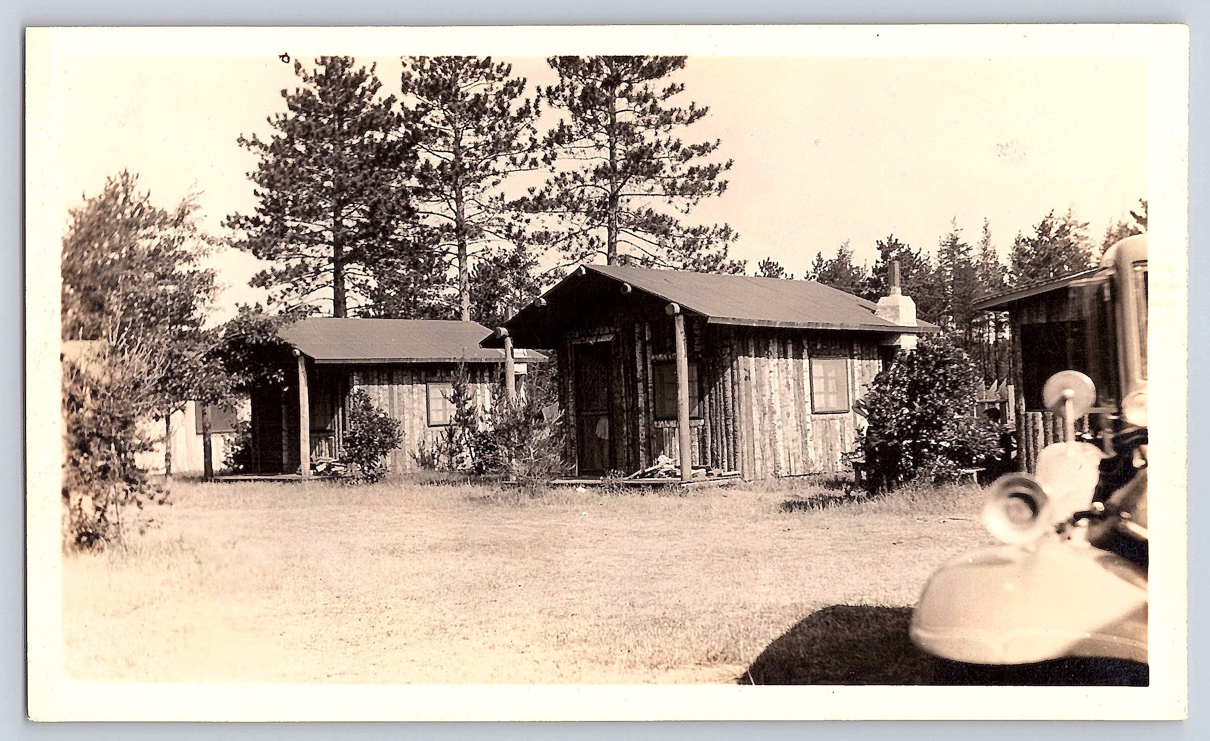 This 3.5 × 5.8 inch photograph captures a rustic cabin surrounded by tall trees, likely from the 1940s. The composition includes a partial view of a vintage car in the foreground, adding a sense of time and place to the scene. The cabin, constructed with wooden logs, is nestled in a natural setting, evoking a sense of tranquility and simplicity.