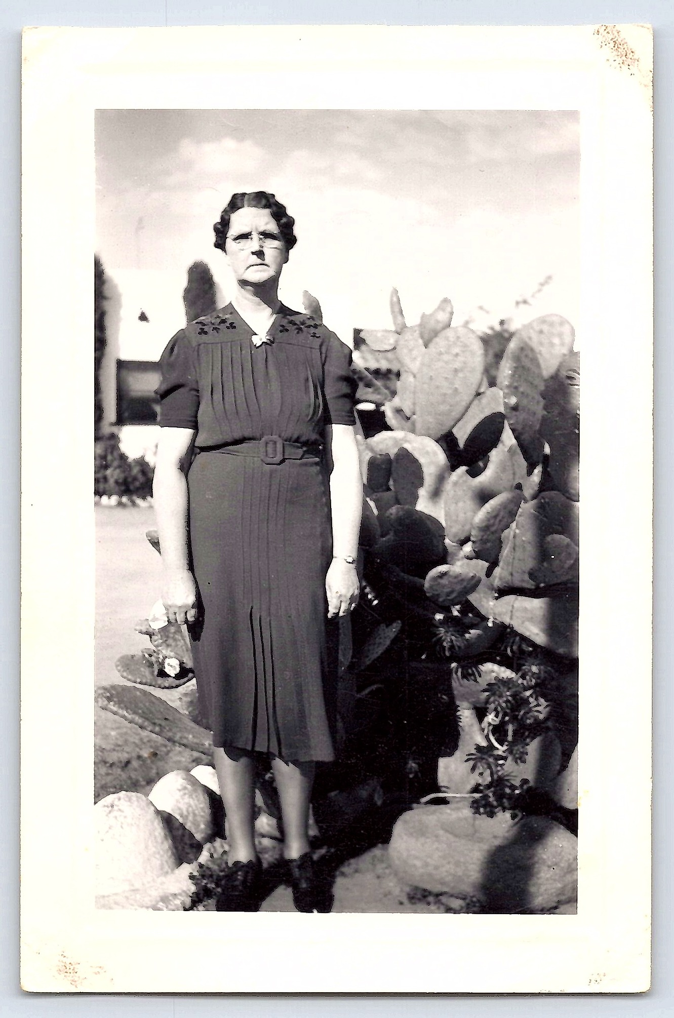 This 3.1 × 4.77 inch photograph captures a woman standing in a garden, surrounded by lush foliage and cactus plants. The subject is dressed in a dark, knee-length dress, and her expression is calm and composed. The composition is well-balanced, with the garden elements providing a natural frame around the subject.